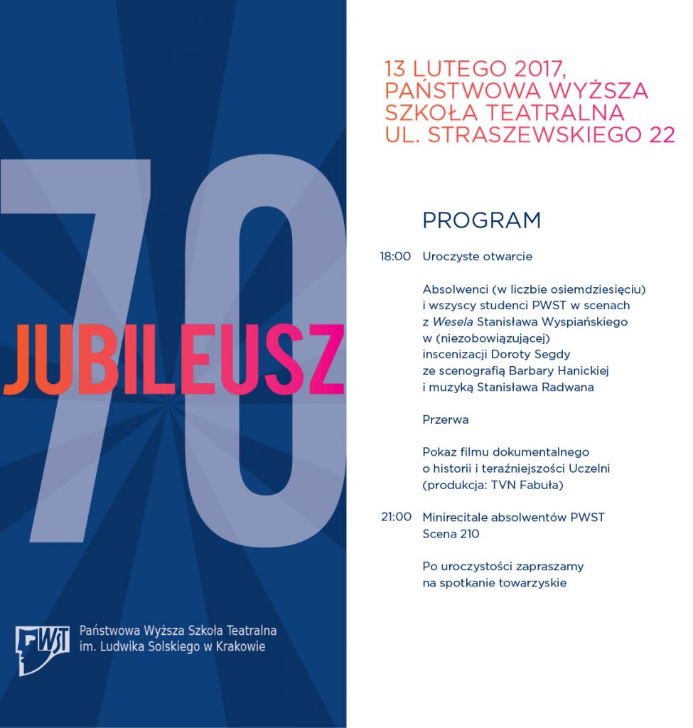 13 lutego 2017 r. o godz. 18.00 w Państwowej Wyższej Szkole Teatralnej w Krakowie przy ul. Straszewskiego 22 odbył się jubileuszowy zjazd absolwentów PWST z okazji 70-lecia Uczelni.